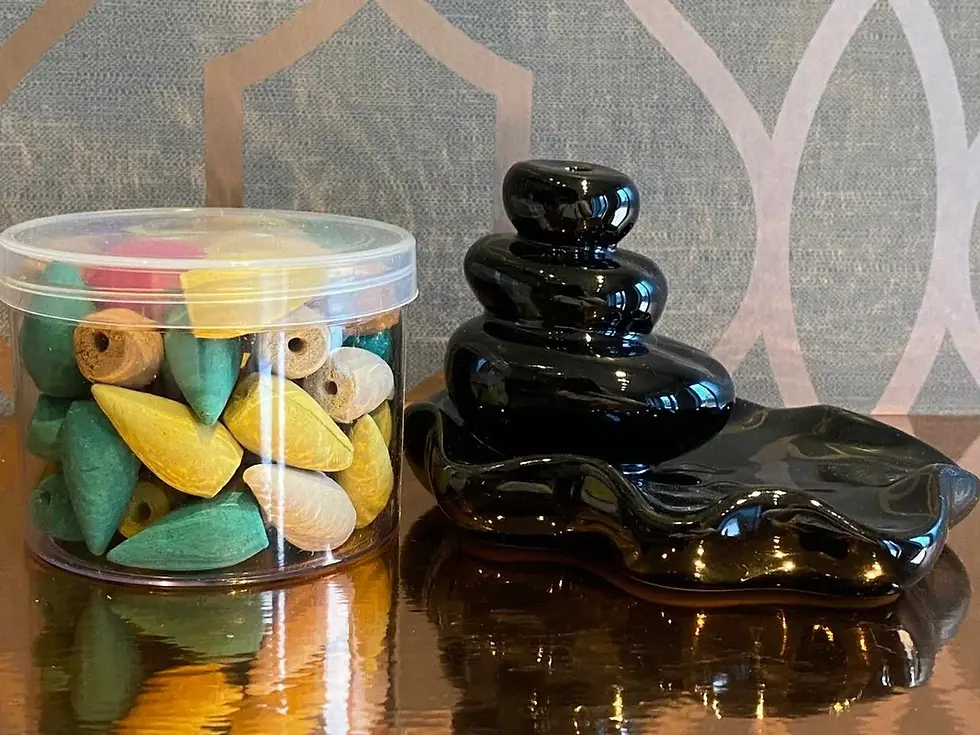 Back Flow Incense Burner - Large Pebbles into Pool & Tub of cones